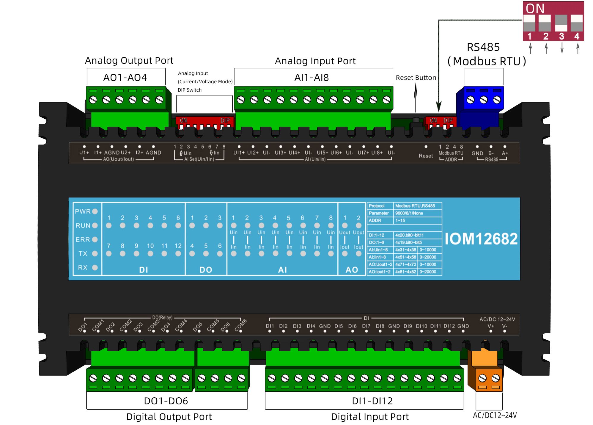 Q④: How to forcibly reset the baud rate of this I/O module to its default value? A④ : Activate the module's hardware reset button (typically labeled Reset). This action immediately restores the baud rate to 9600, ensuring rapid reset of the communication link to its initial state.