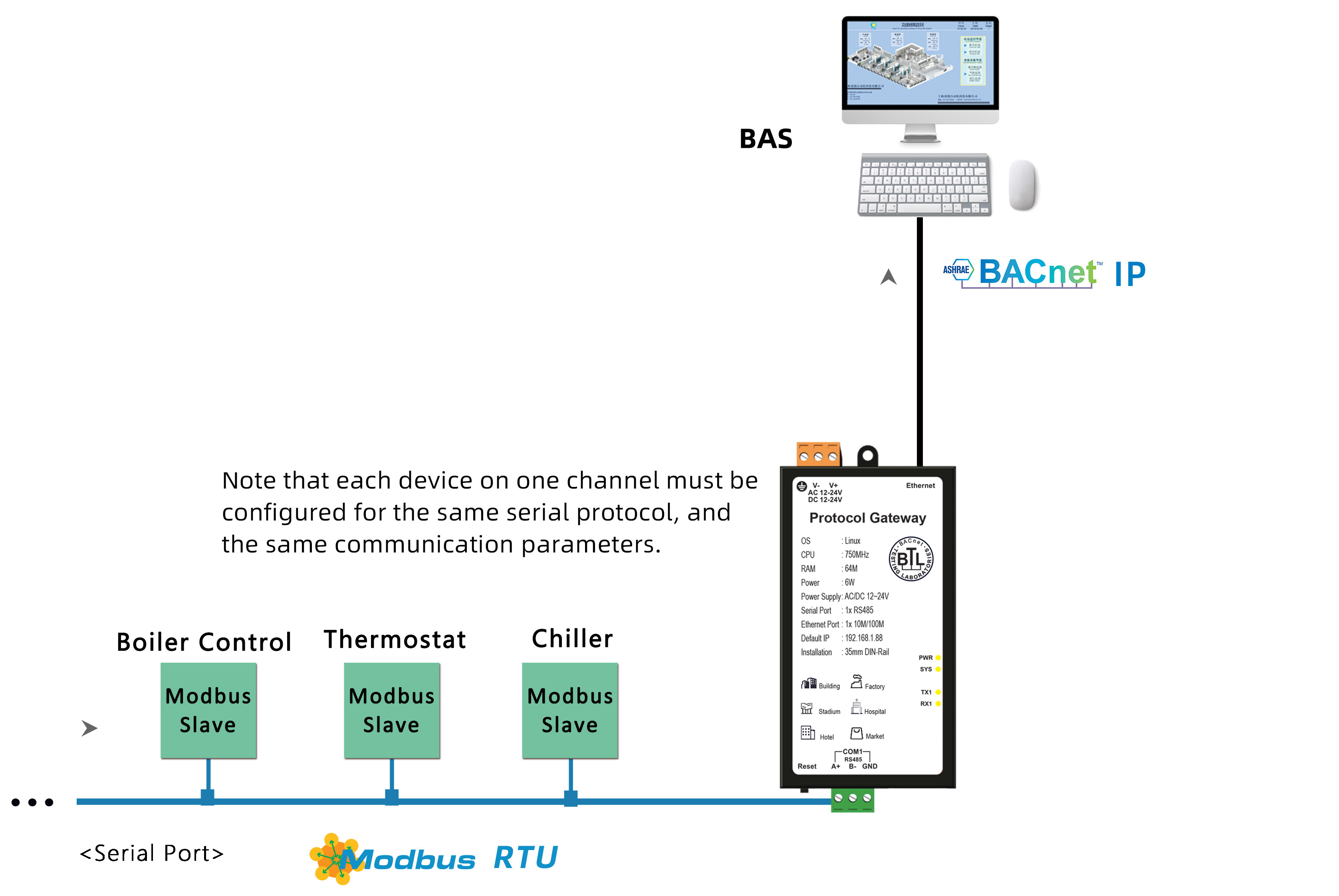 Addressing the integration of Modbus RTU devices with building automation configuration software such as Johnson Controls' Metasys, Honeywell's EBI or Niagara, Siemens' Insight or Desigo CC, and Schneider's EBO, including various devices that support the Modbus RTU protocol like PLC, DDC, temperature controller, elevator, HVAC system, UPS, fire alarm system, smart lighting, electricity meter, water meter, and more.