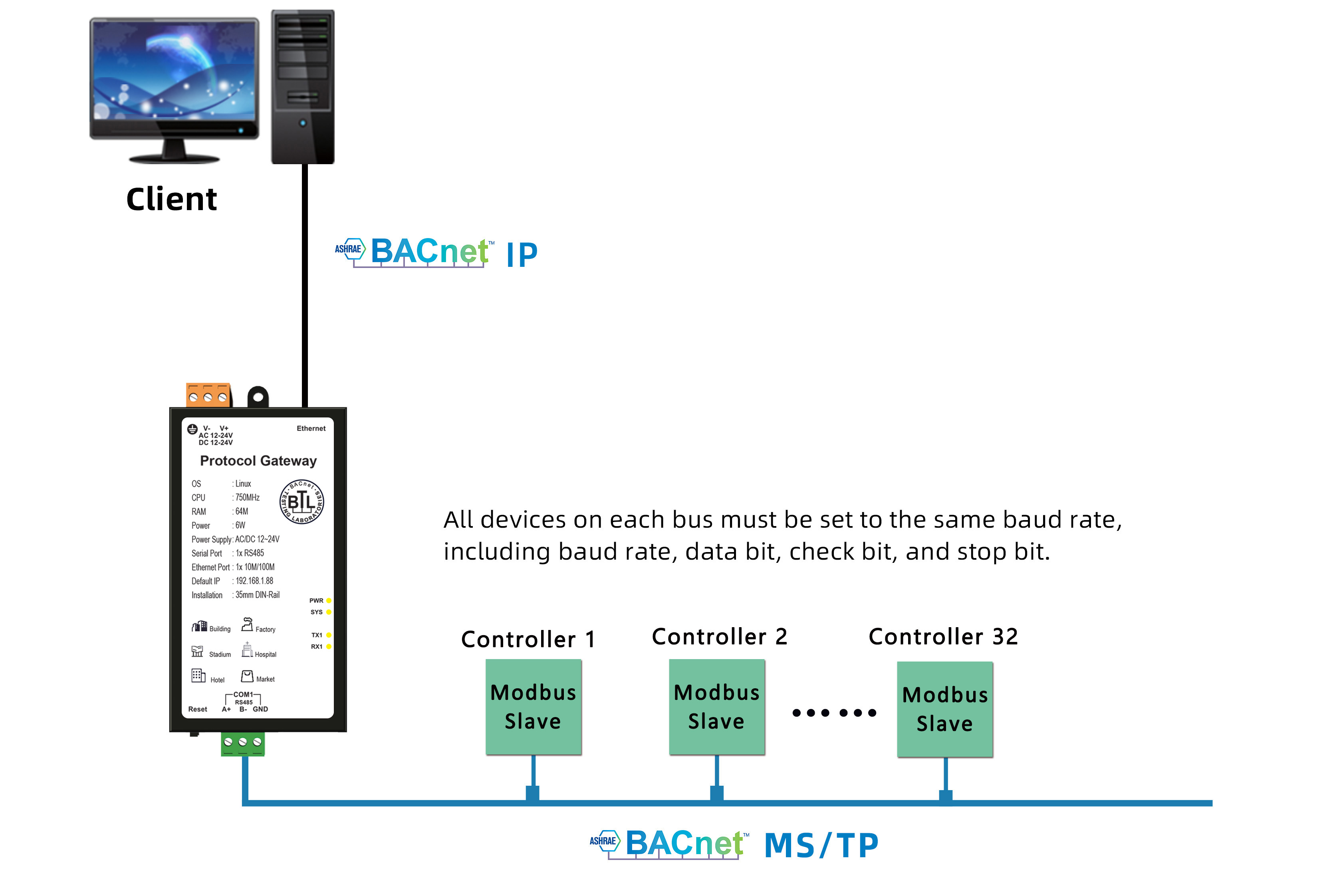 Router serves as an Ethernet router, enabling transparent transmission between the BACnet MS/TP bus and BACnet IP over Ethernet.