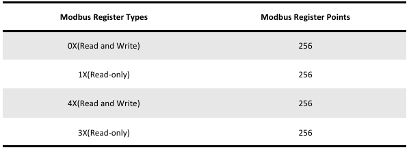 SNMP gateway supports SNMP servers. The supported register types and maximum number of points for the server are listed in the table below.