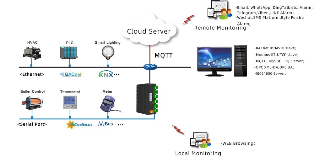 IoT gateway is applied in building automation systems or industrial fields to connect Modbus RTU devices. It resolves the issue of integrating non-BACnet devices with building control configuration software such as Johnson Controls' Metasys, Honeywell's EBI or Niagara, Siemens' Insight or Desigo CC, and Schneider's EBO. Additionally, it addresses the integration of serial Modbus RTU devices, such as PLC, DDC, thermostat, elevator, HVAC system, UPS, fire Alarm, smart lighting, electricity meter, water meter, etc., with configuration software like Citect, IFIX, RSVIEW, WinCC, Kingview, and ForceControl via the Modbus TCP protocol over Ethernet.