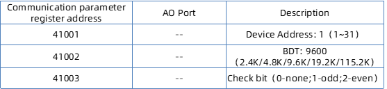 A ② :Use third-party software Modbus Poll, follow chapter “ Description of Definition for Registers”, Read the data from registers 41001, 41002 and 41003, which represent device addresses (1-31), communication baud rate of 9600 and Check bit(0 none;1-odd;2-even). Modify the module communication parameters according to the description in the "Instructions" column. After power failure and restart, the set parameters take effect. (Station number 41001 displays the station number set by the current dip switch. If software is required to set the station number, the dip switches 1/2/3/4/5 must be placed in the OFF position.)