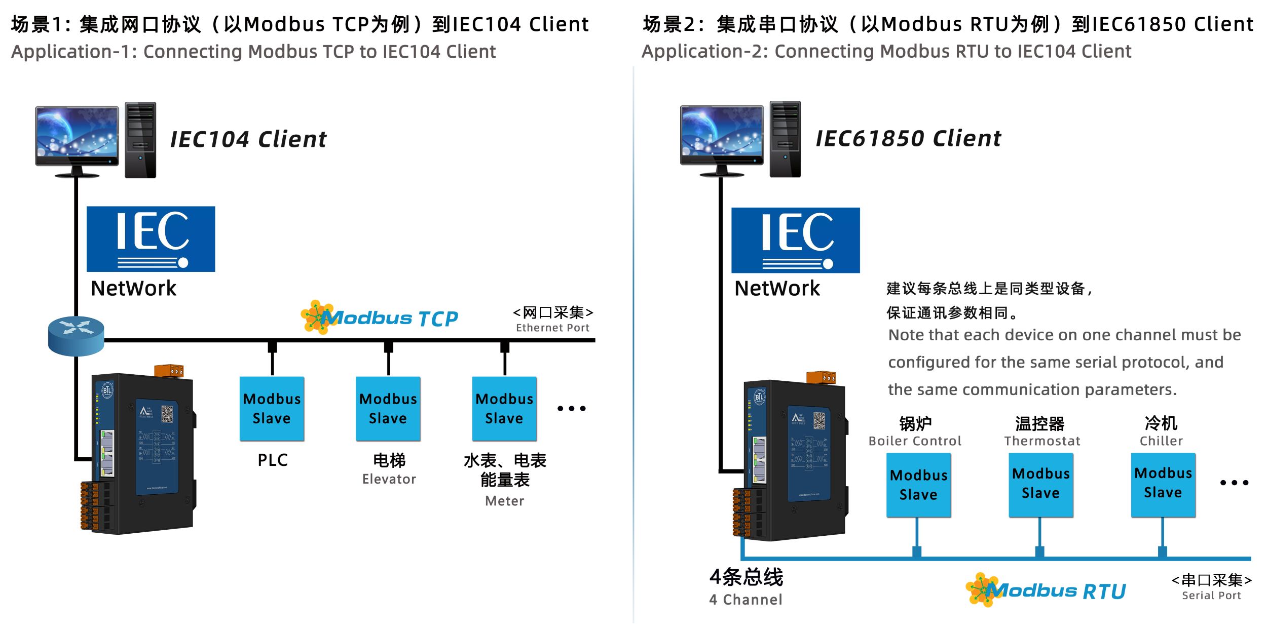 解决PLC、空调、电梯、消防、灯光控制系统、电表、水表不同产品,通过硬件网关将Modbus,BACnet等等其他各家不同的协议转换成IEC104规约或IEC61850规约,这样IEC客户端组态软件就可以通过X2IEC网关访问现场设备了,实现数据采集、数据监控、以及远程读取现场温度、报警状态等各种数据。