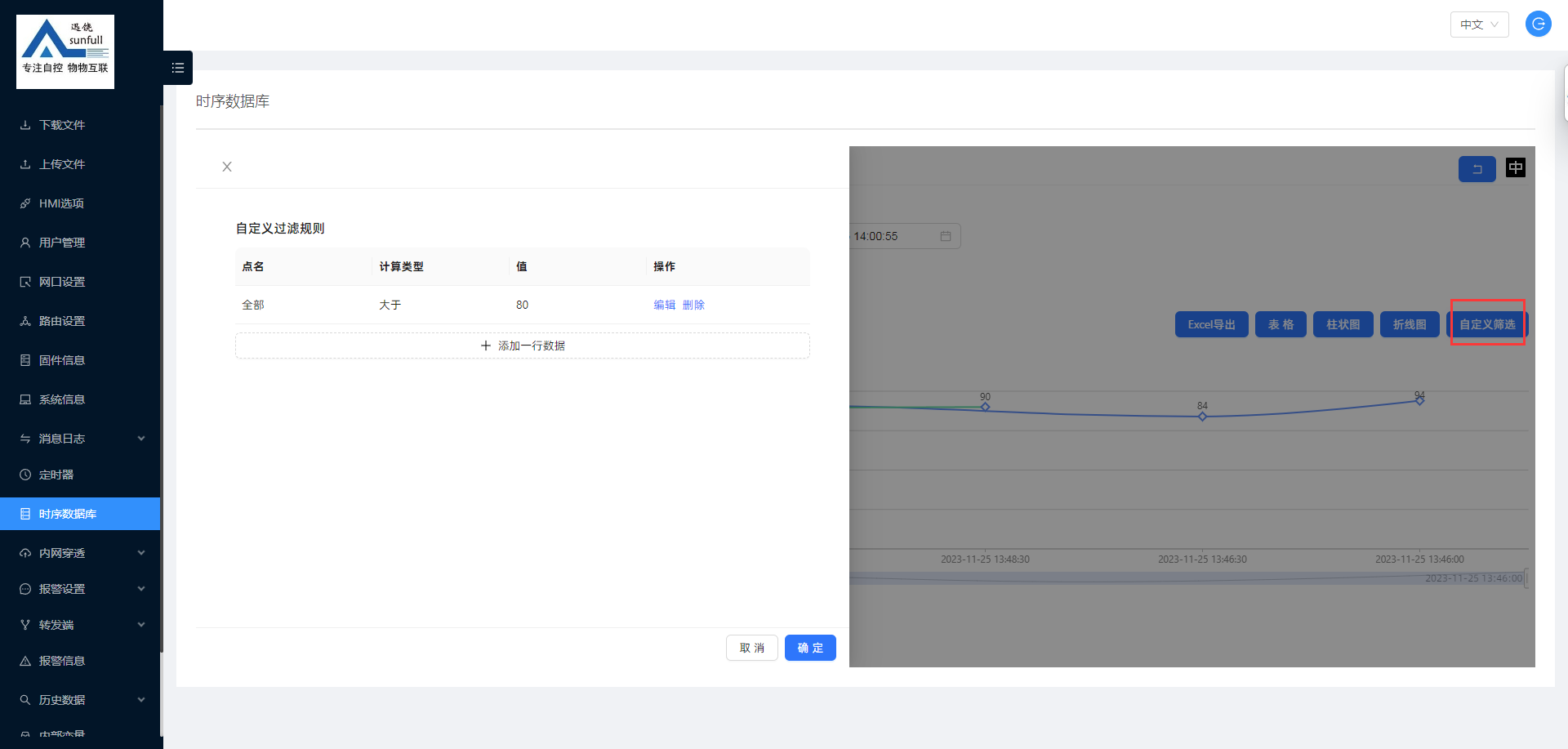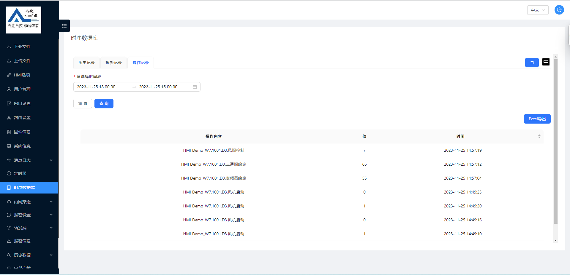 时序数据库可查询历史数据、报警记录、操作记录。历史数据可以柱状图、折线图展示,数据可导出EXECL方便用户查询。大概操作及展示如下: