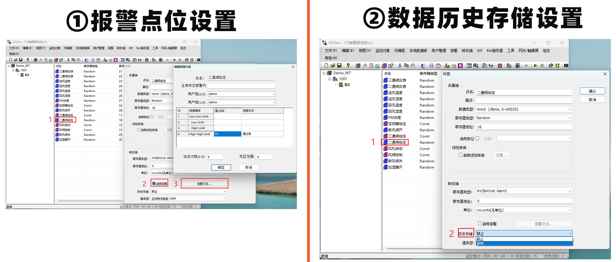 2. ①报警点位设置;②数据历史存储设置 ;